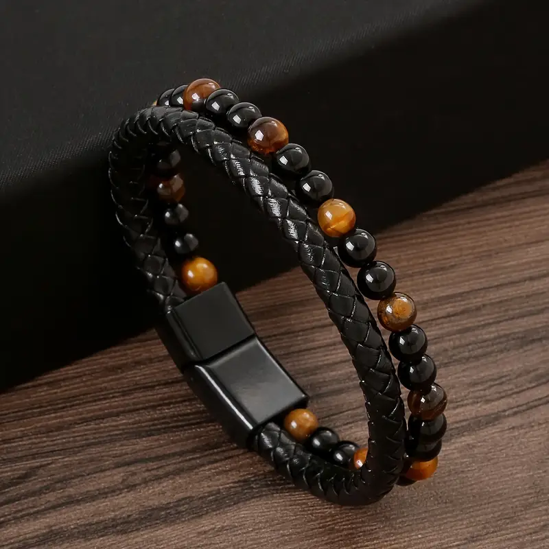 A Handmade Woven Bracelet for Men Made of Faux Leather And Tiger Eye Stone Beads.