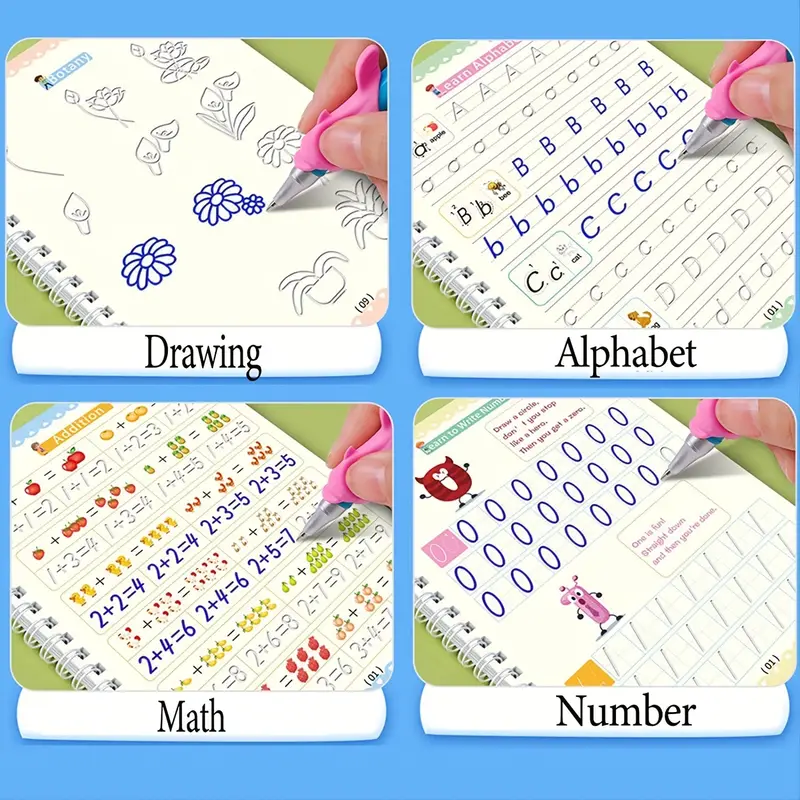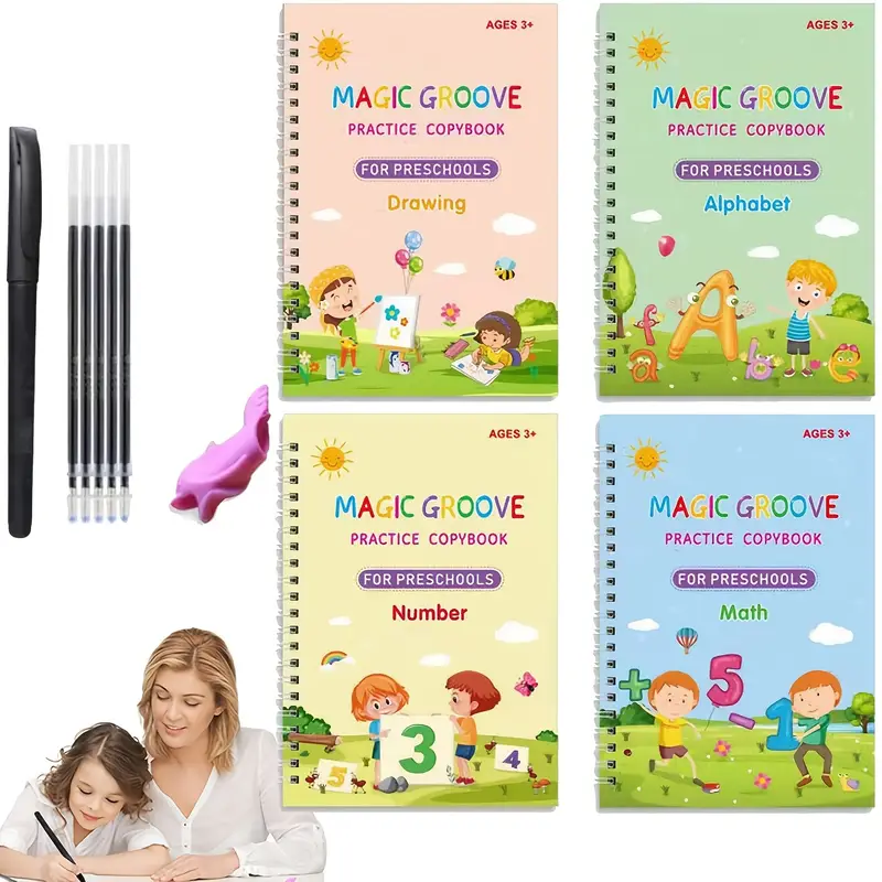Kids 3D Slot Practice Copybook 4pcs Set with 1 Pen & 5 Refillable Cartridge Cartridge Holder | Magic Writing Kit | English Handwriting Practice Workbook | Letter Word Calligraphy Copybook | Reusable Teaching Aid